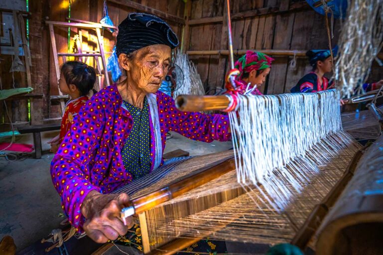 De laatste dag van je Ha Giang Loop gaat via rustige achterafroutes die nauwelijks door andere reizigers worden gebruikt. Je bezoekt Lung Tam, een Hmong-weefdorp waar vrouwen traditioneel linnen maken en verven.