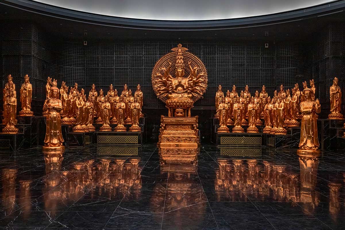 Binnenruimte met vergulde boeddhistische beelden bij het Bodhisattva-heiligdom op Ba Den Mountain