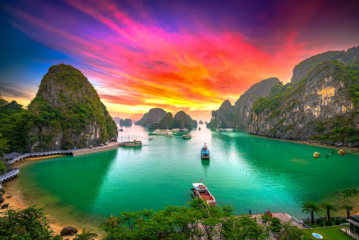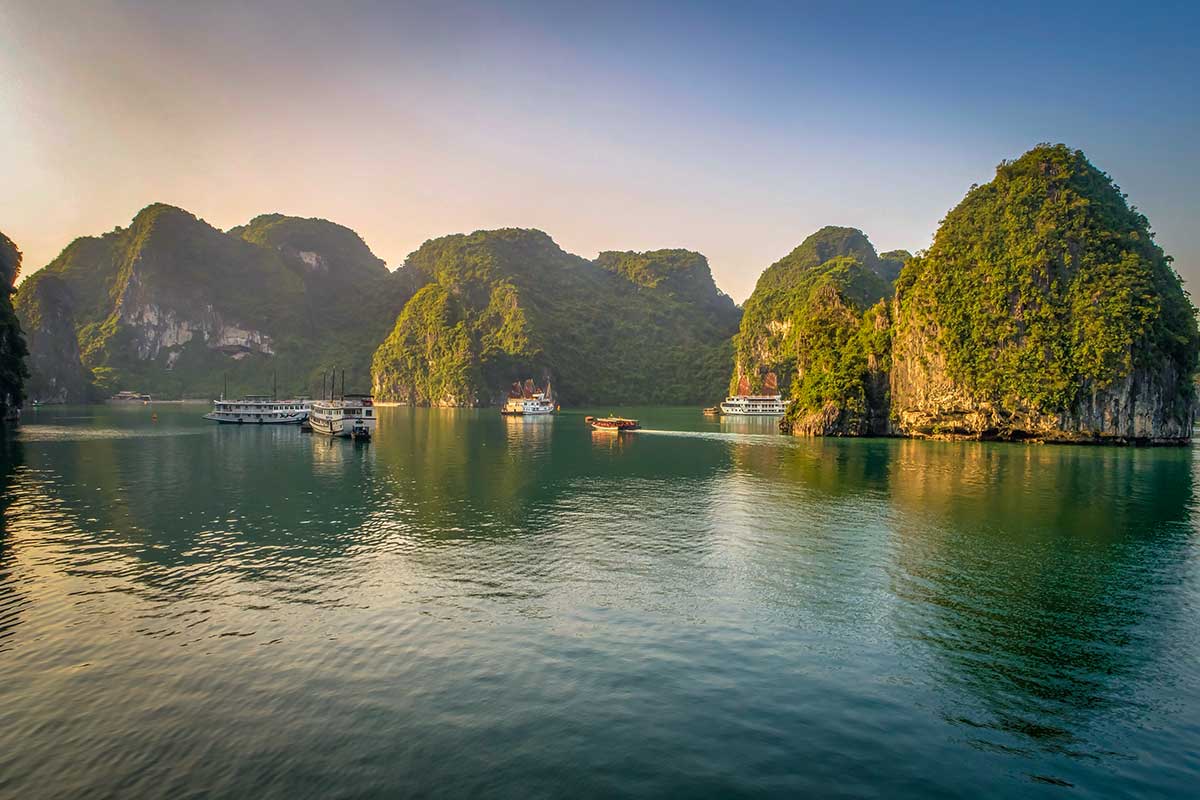 Halong Bay, een UNESCO-werelderfgoed, staat bekend om zijn duizenden kalkstenen eilanden die uit het turquoise water oprijzen. Het is een iconische bestemming die zowel rust als majestueuze schoonheid uitstraalt.