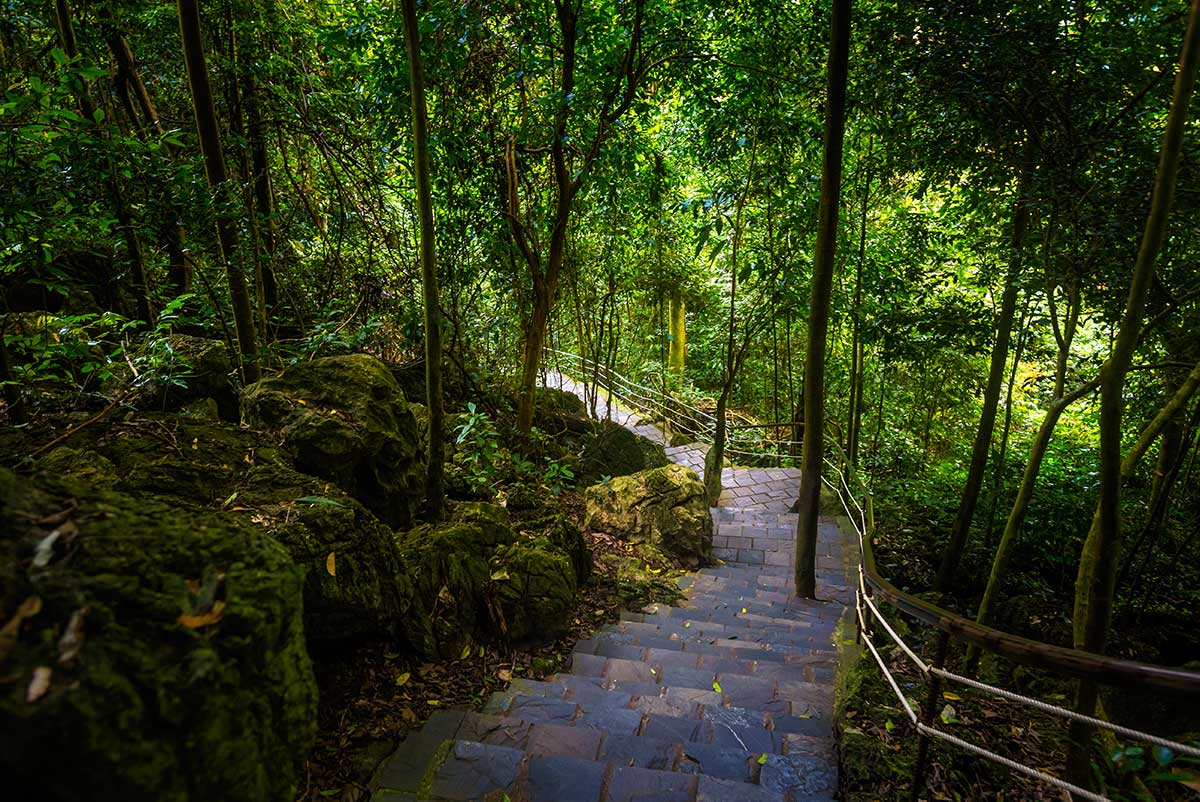 Stenen trap door dicht groen junglegebied richting de ingang van Paradise Cave (Thien Duong) in Phong Nha–Ke Bang National Park.