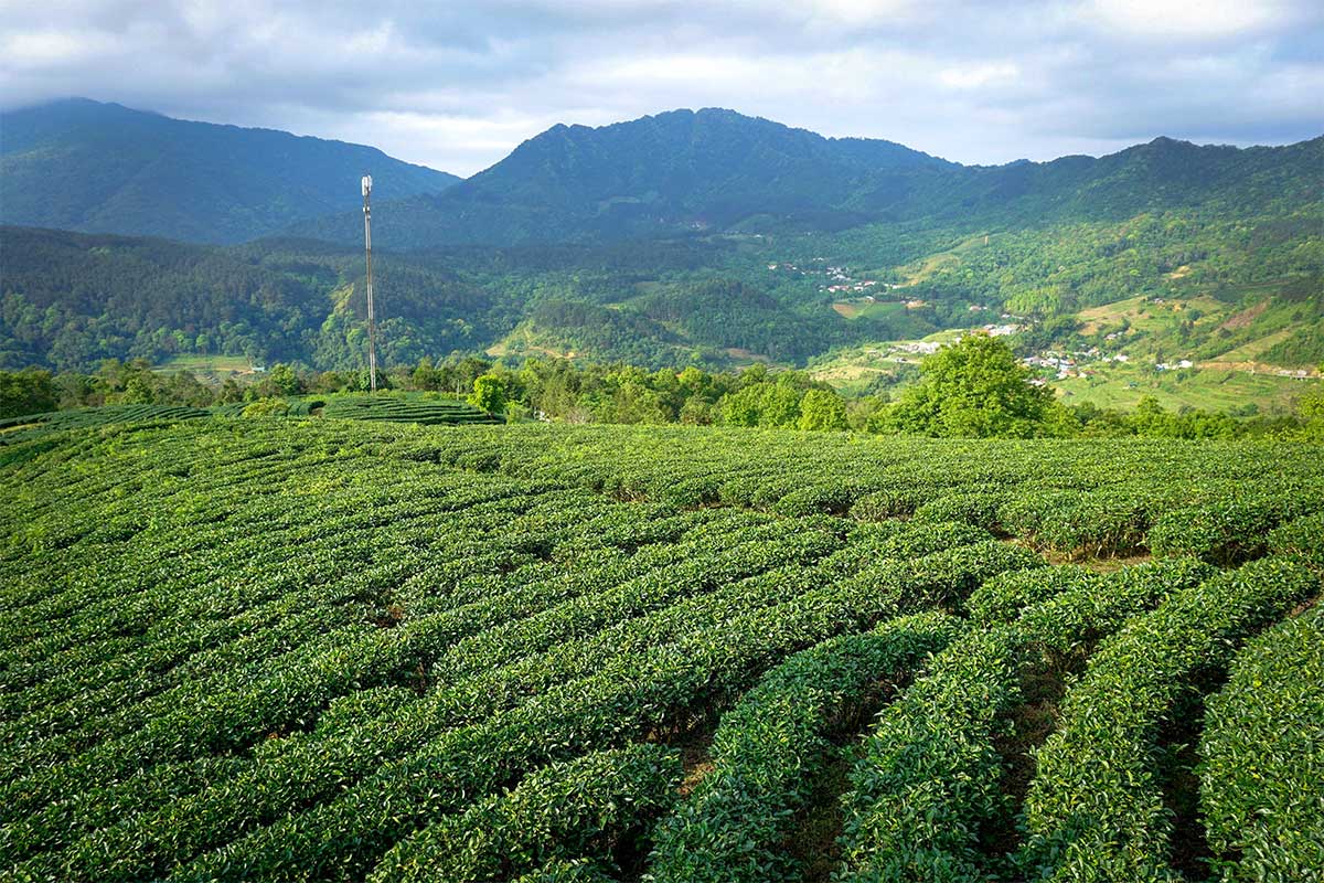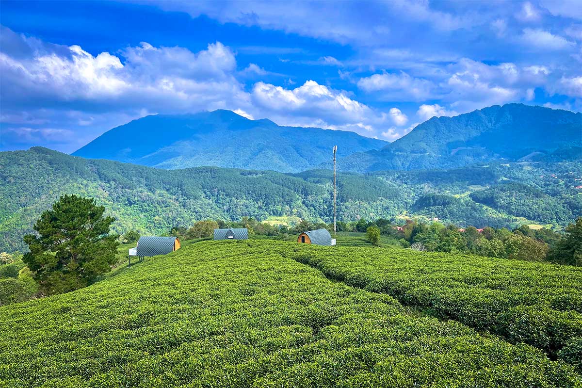 Verspreid over de heuvels liggen theeplantages die samen zo’n 30 hectare beslaan. De velden liggen open en bieden uitzicht over het omliggende landschap.