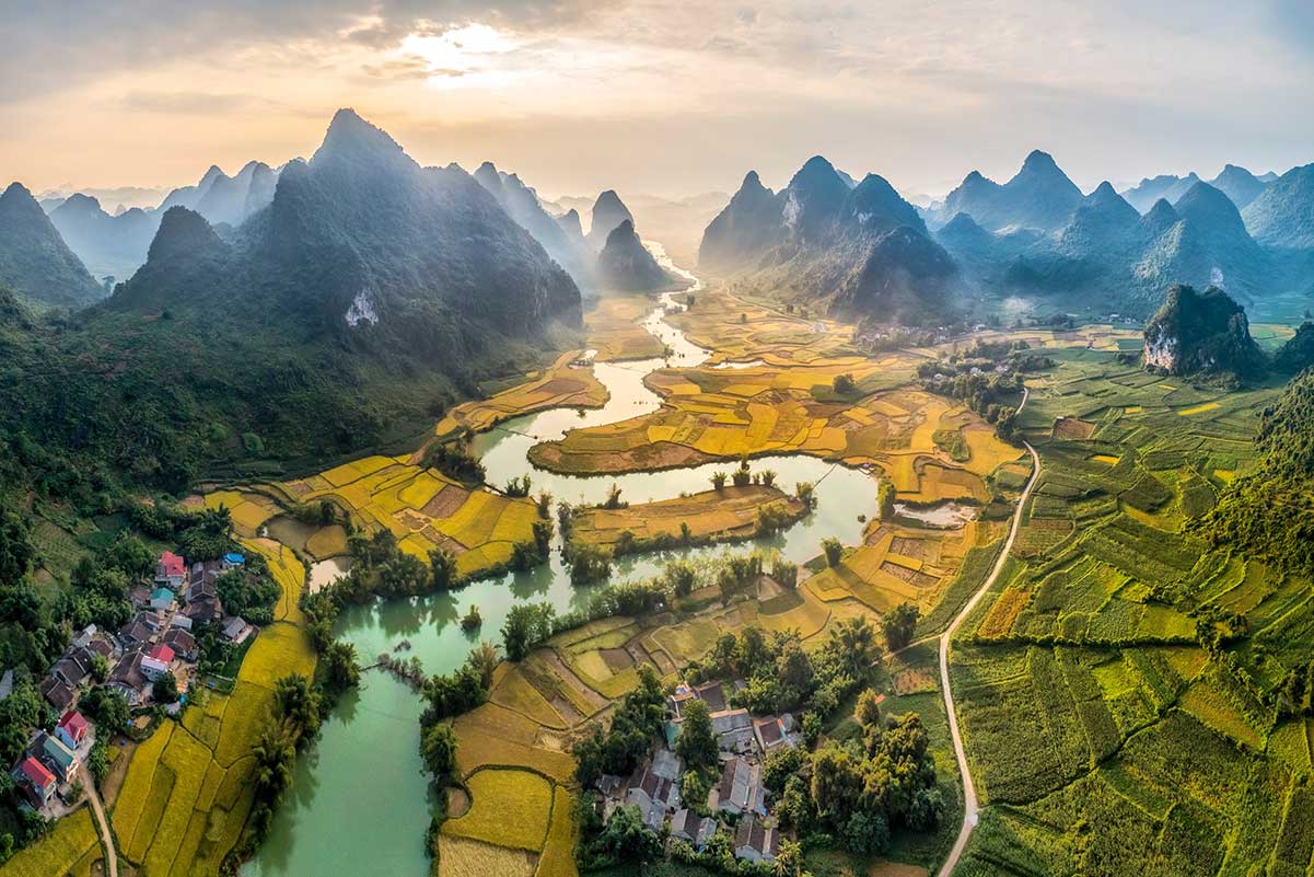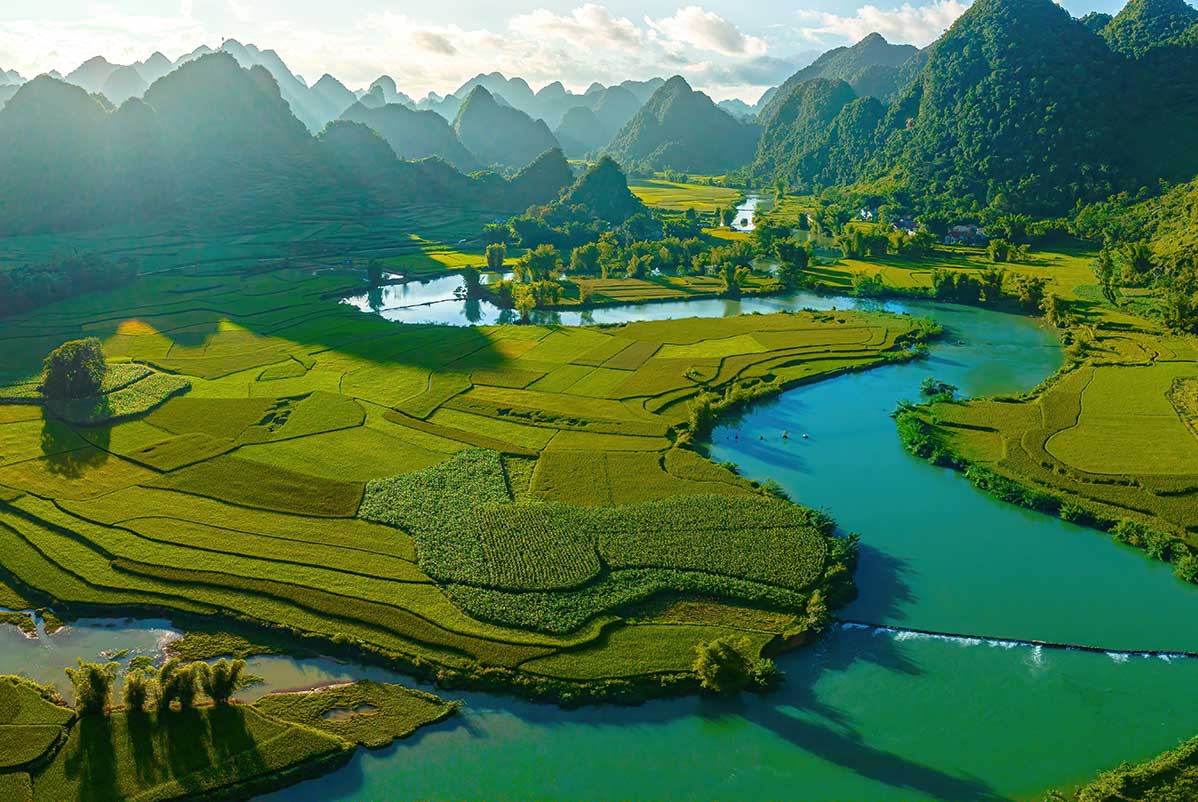 De rijstvelden van Phong Nam liggen breed uitgespreid tussen de bergen en bepalen het open karakter van de vallei. In het groeiseizoen zijn ze frisgroen, tijdens de oogst diepgeel. De omliggende kalkstenen bergen zijn begroeid met jungle en zorgen voor een duidelijk contrast tussen vlak land en steile hellingen. Het landschap voelt groots aan, maar blijft overzichtelijk doordat alles zich in één vallei afspeelt.