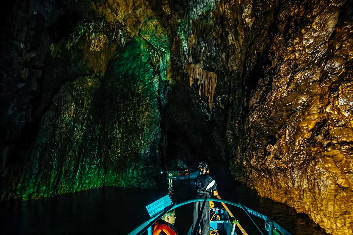 Bij de ingang vaart de boot direct de grot in. De temperatuur daalt meteen, wat prettig is op warme dagen. Zodra je de grot binnen bent, wordt de motor uitgezet en vaart de boot verder met een roeistok. Dat maakt het opvallend stil in de grot. Je glijdt door grote, donkere ruimtes die subtiel zijn verlicht om de stalactieten en stalagmieten zichtbaar te maken.