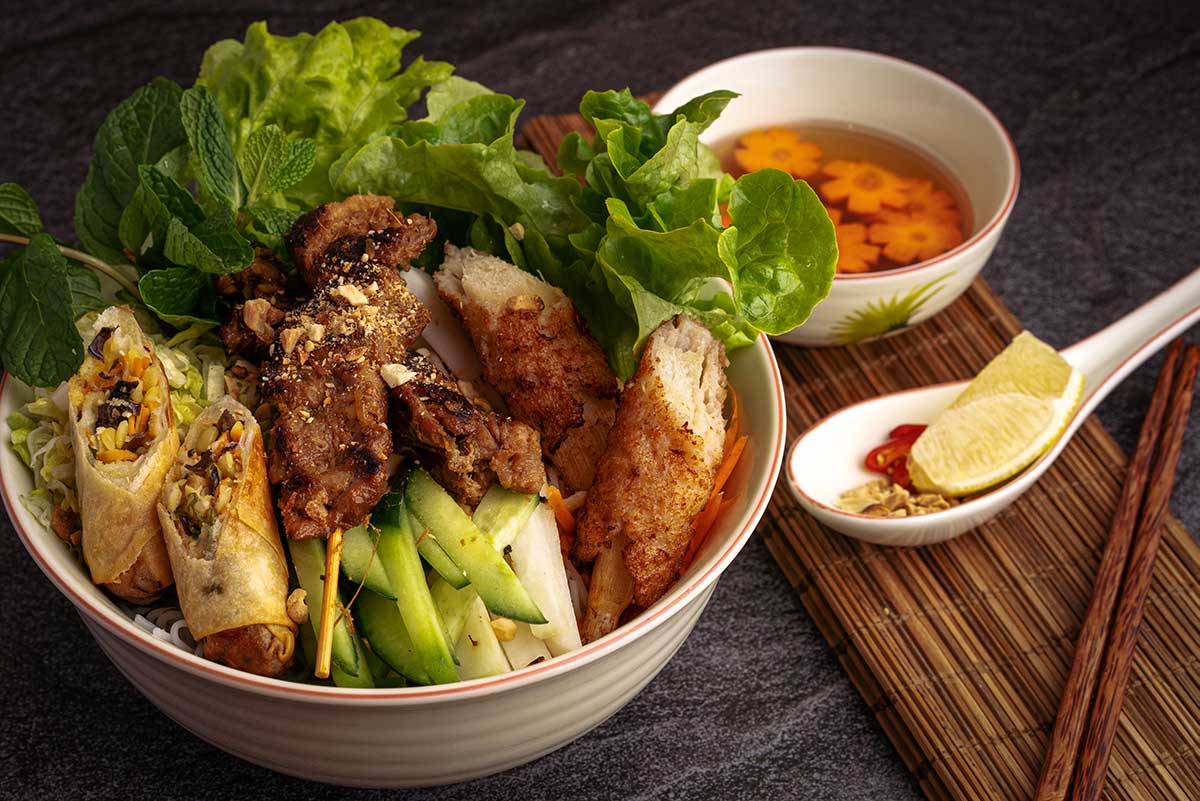 Gegrild varkensvlees met rijstnoedels, kruiden en een zoetzure saus. Vooral bekend uit Hanoi, maar inmiddels in veel steden te vinden.