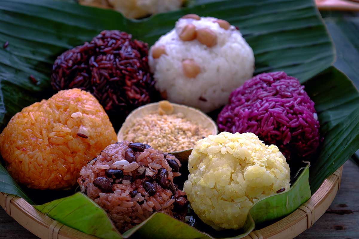Kleverige rijst met hartige toppings zoals kip, varkensvlees of gebakken uitjes. Vaak gegeten als ontbijt of snack.