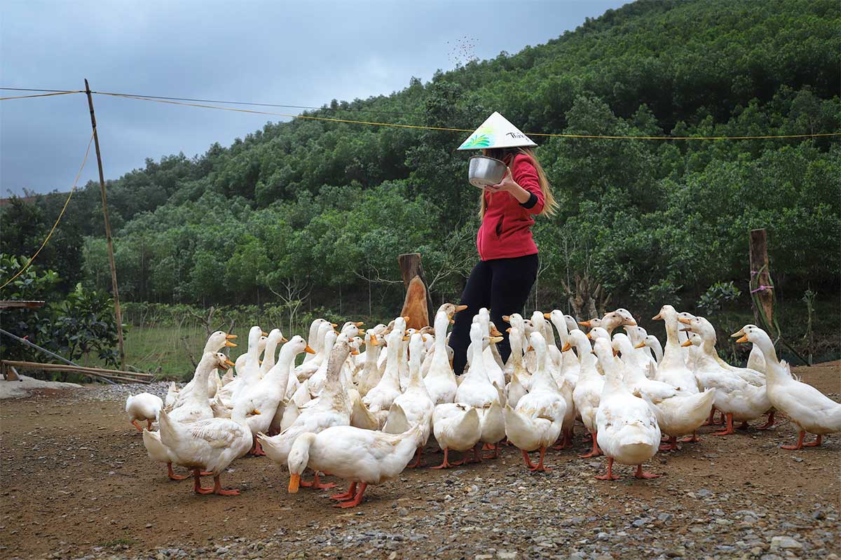 Bezoeker voert een groep eenden bij The Duck Stop in Phong Nha, een populaire boerderijervaring in de regio.