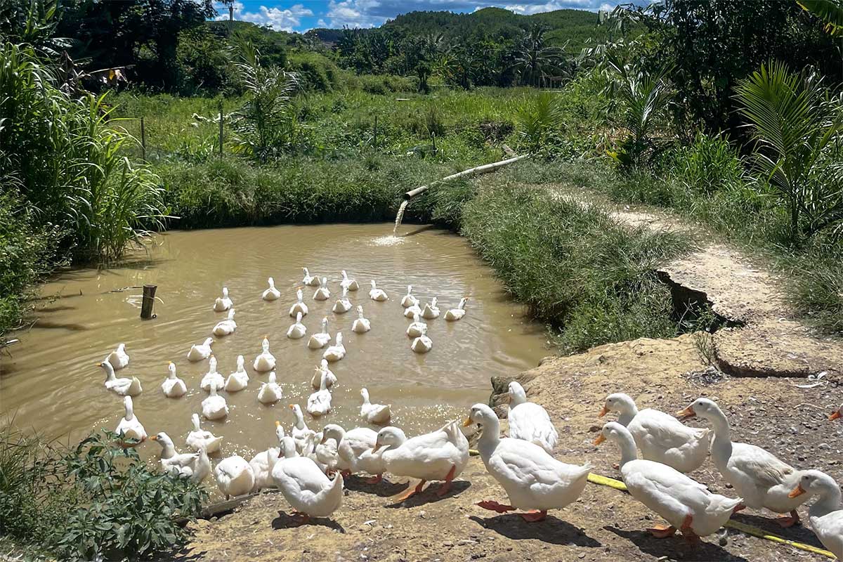 Overzicht van de eendenboerderij van The Duck Stop in Phong Nha, met eenden rond de vijver op het terrein.