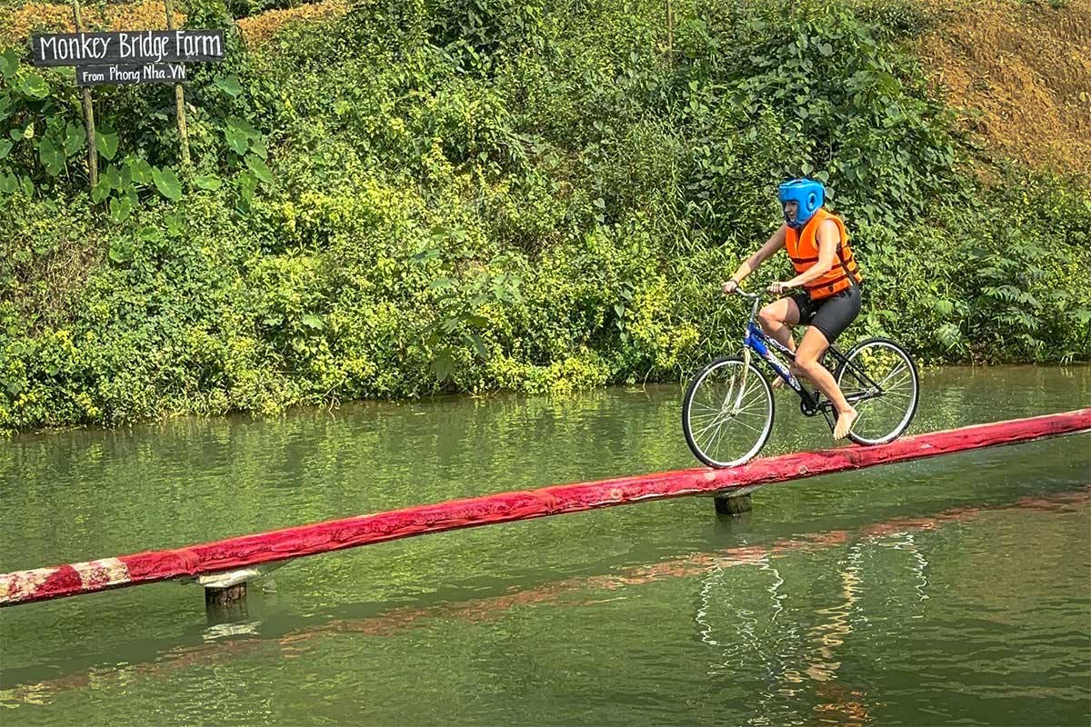 Bezoeker fietst over de smalle Monkey Bridge bij Phong Nha, een eenvoudige houten brug over de rivier in een landelijke omgeving.