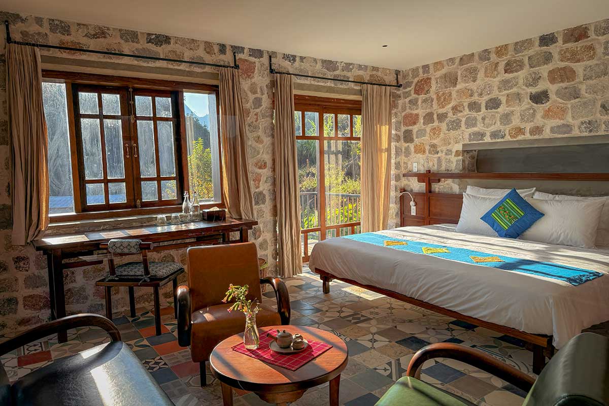 Bij onze privétours overnacht je in onze eigen Ha Giang Aya Lodge, waar je kunt rekenen op comfortabele kamers, warme douches en een authentieke, rustige omgeving midden in de bergen.